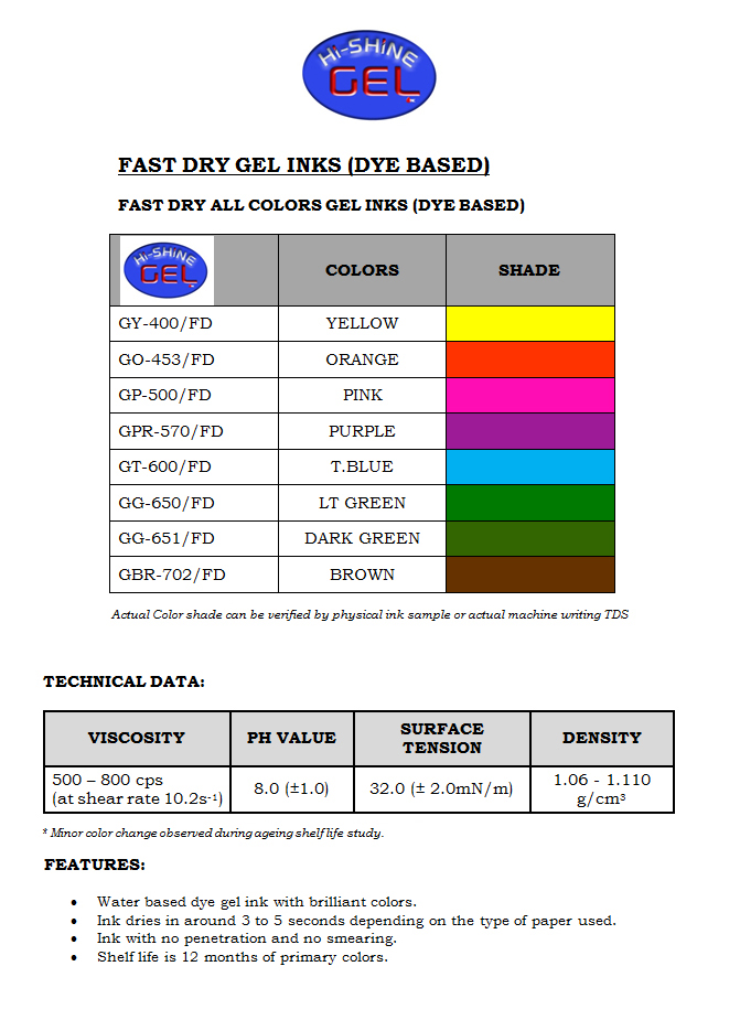 FAST DRY GEL ALL COLOR INKS (DYE BASED)