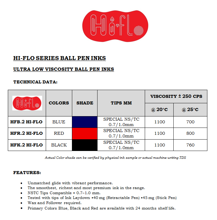 ULTRA LOW VISCOSITY BALL PEN INKS HI-FLO SERIES